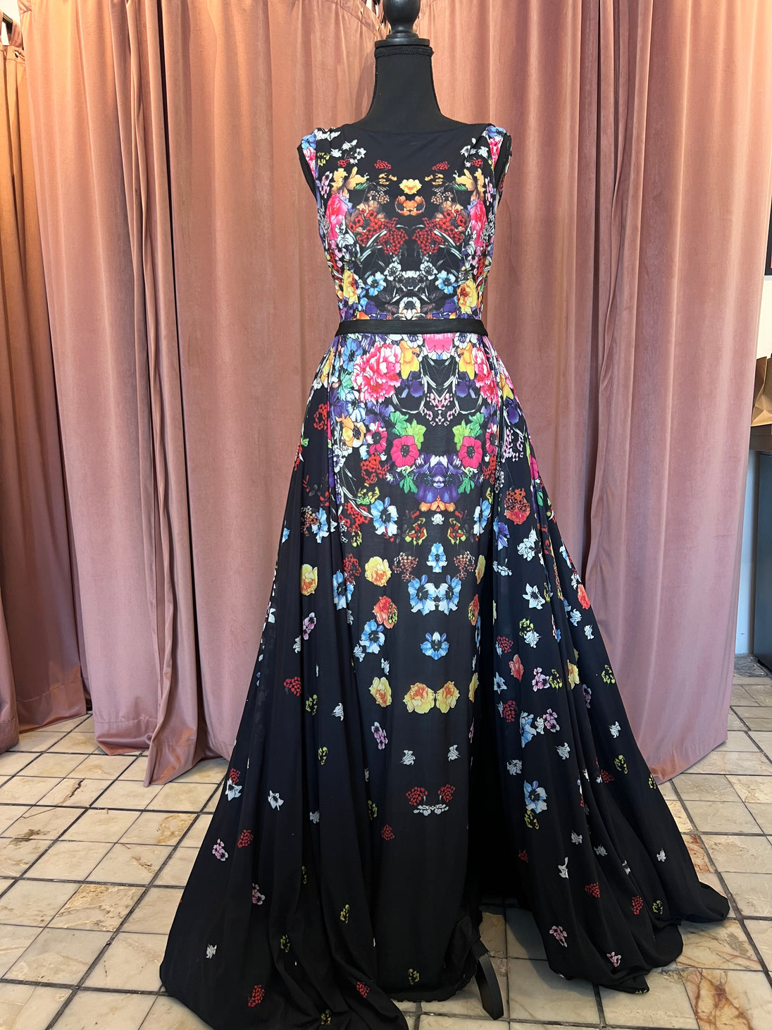 JOVANI vestido negro con flores by ANBA PRELOVED